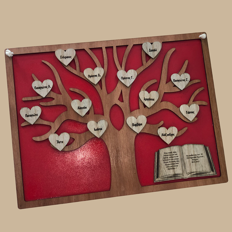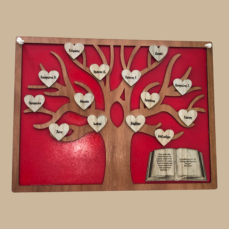 Χειροποίητο αναμνηστικό κάδρο, από ξύλο κόντρα πλακέ, με θέμα ένα δεντράκι, διακοσμημένο με τα ονόματα των μαθητών χαραγμένα επάνω σε καρδούλες και ένα βιβλίο με χαραγμένη αφιέρωση για τους δασκάλους!