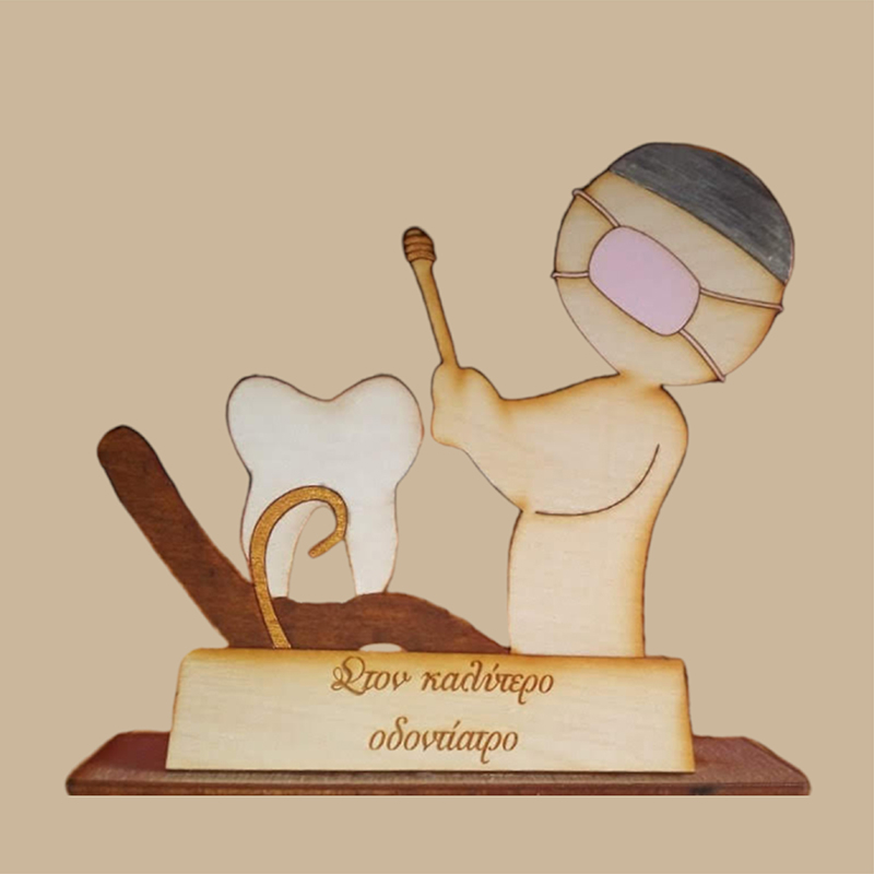 Ξύλινο διακοσμητικό με την φιγούρα οδοντιάτρου εν ώρα εργασίας και αφιέρωση