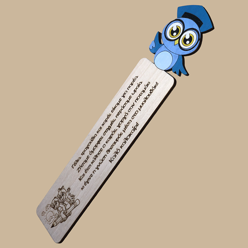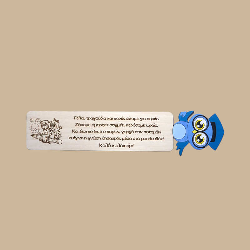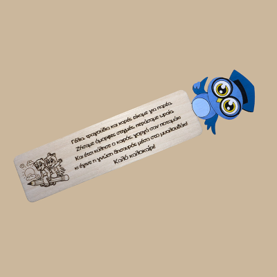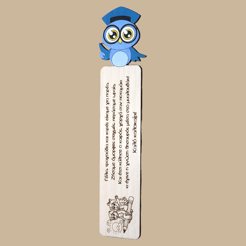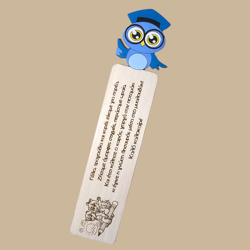 Ξύλινος σελιδοδείκτης με θέμα την κουκουβάγια και ευχές για τους δασκάλους.