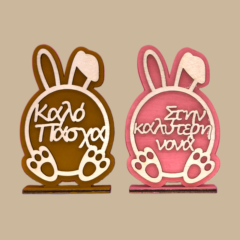 Διακοσμητικά πασχαλινά κουνελάκια από ξύλο κόντρα πλακέ, με ευχή για τους αγαπημένους μας.