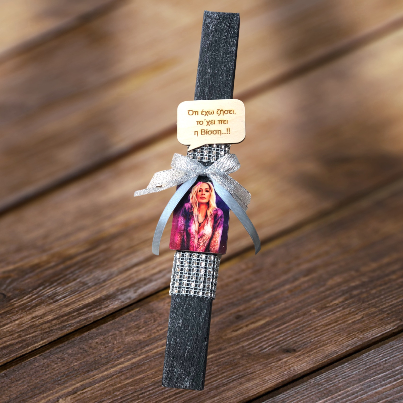 Λαμπάδα με ξύλινο διακοσμητικό Βίσση και quote "Ότι έχω ζήσει, το΄χει πει η Βίσση"