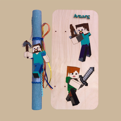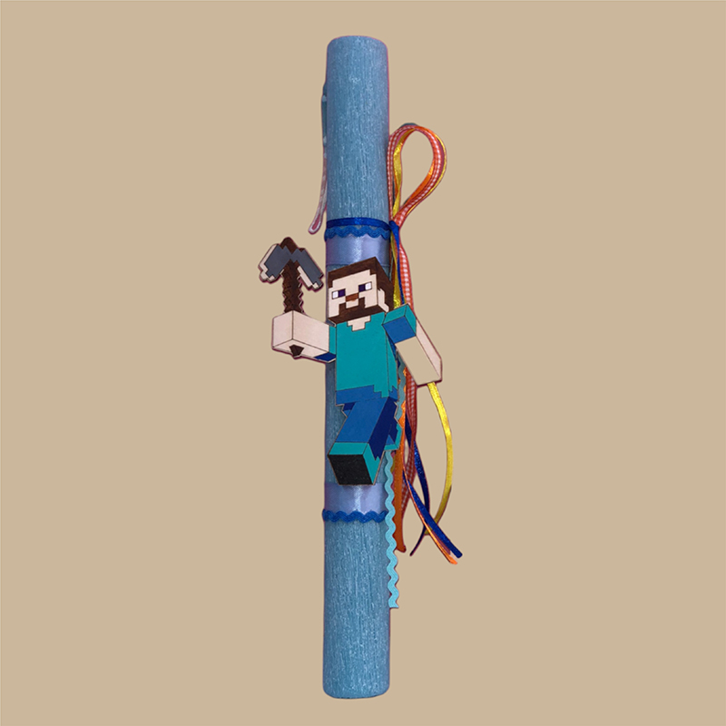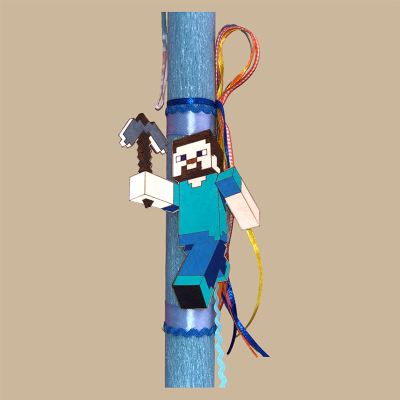 Αρωματική λαμπάδα στο χρώμα της επιλογής σας, διακοσμημένη με πολύχρωμες κορδέλες και ξύλινη φιγούρα Minecraft, ζωγραφισμένη στο χέρι.