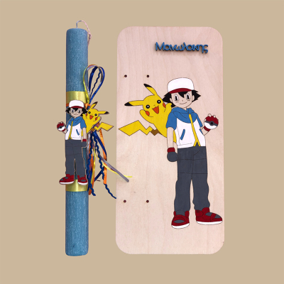 Αρωματική λαμπάδα διακοσμημένη με κορδέλες και ξύλινη φιγούρα Pokemon, ζωγραφισμένη στο χέρι.