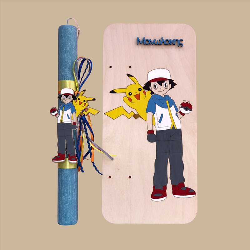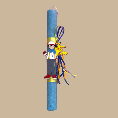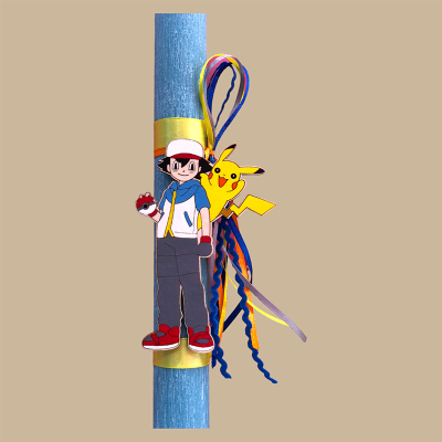 Αρωματική λαμπάδα στο χρώμα της επιλογής σας, διακοσμημένη με πολύχρωμες κορδέλες και ξύλινη φιγούρα Pokemon, ζωγραφισμένη στο χέρι.