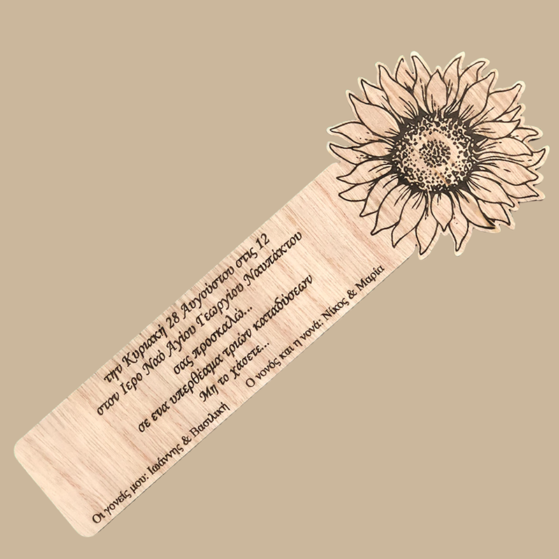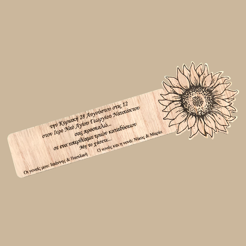 Προσκλητήριο από ξύλο κόντρα πλακέ, με θέμα το λουλούδι "ήλιος" (ηλιοτρόπιο)