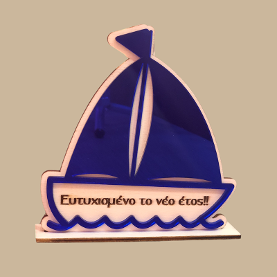 Ξύλινο διακοσμητικό γούρι σε σχέδιο βάρκα, από μπλε plexiglass mirror με ξύλινη πλάτη στην οποία είναι χαραγμένη ευχή