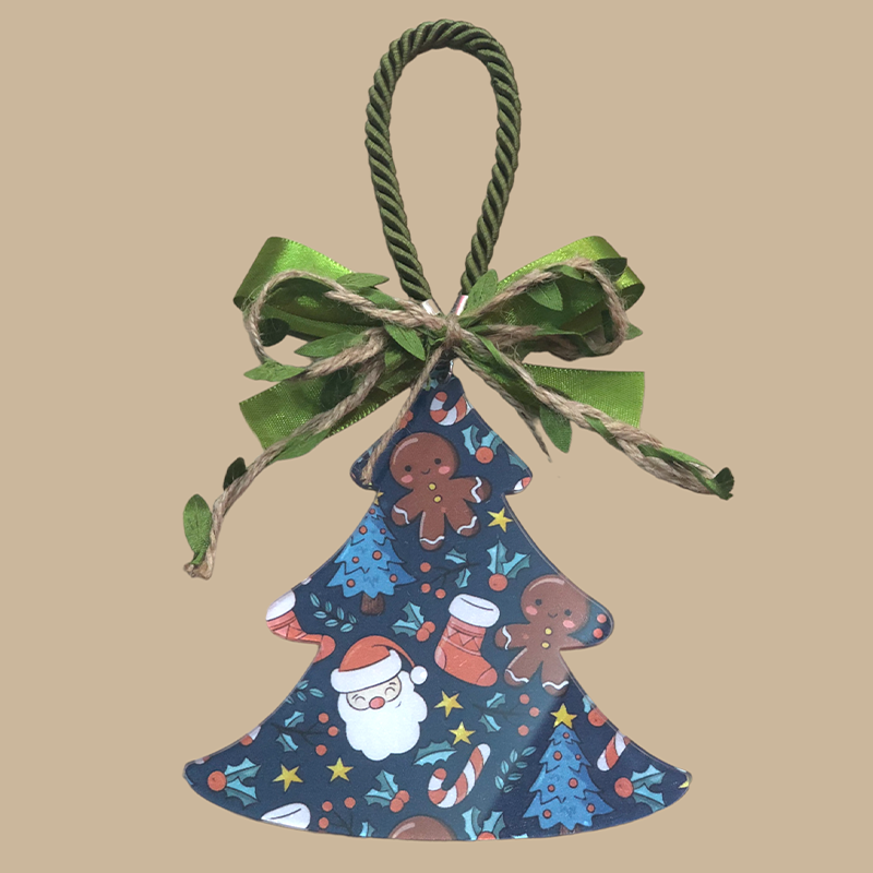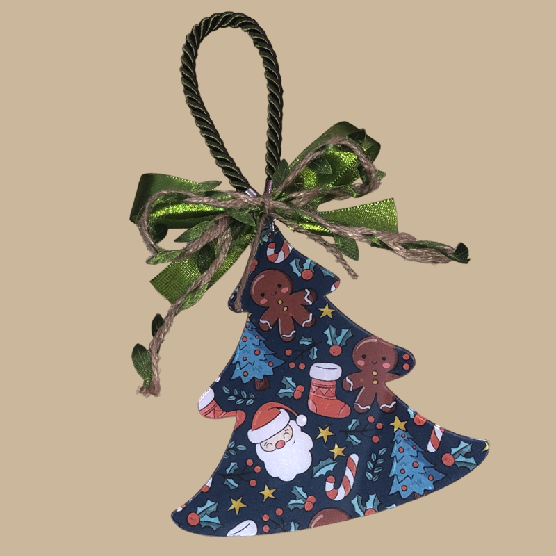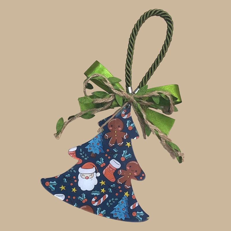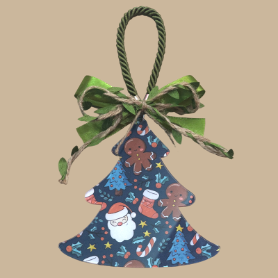 Γούρι κρεμαστό δεντράκι από plexiglass εκτυπωμένο με χριστουγεννιάτικο μοτίβο, διακοσμημένο με σκοινί και κορδέλες σε κυπαρισσί αποχρώσεις και plexiglass λεπτομέρεια "2024"