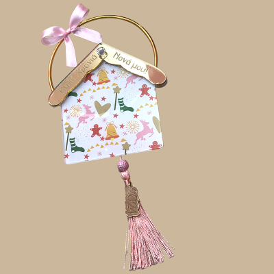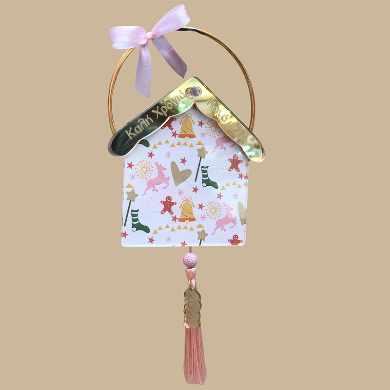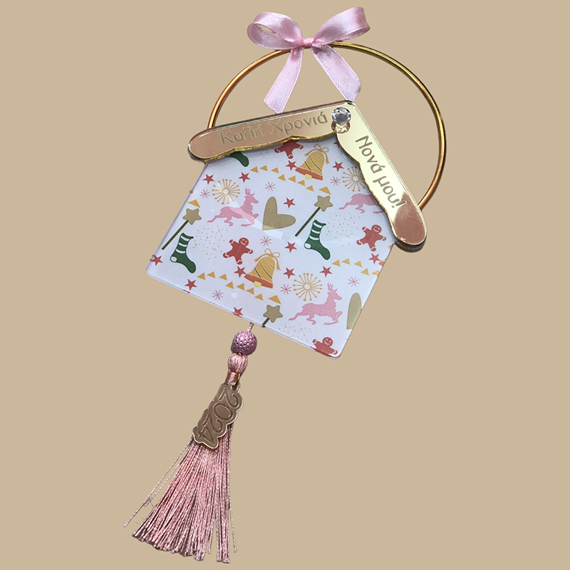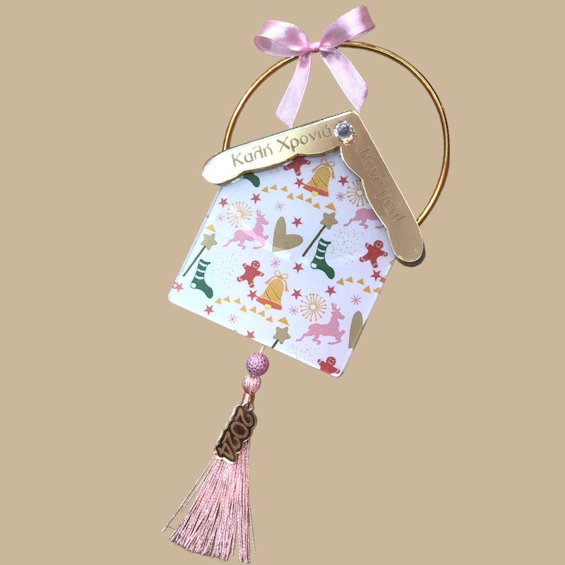 Είναι κρεμαστό σε χρυσό κρίκο και διακοσμημένο με ροζ φιογκάκι και φουντίτσα, καθώς και με λεπτομέρεια από χρυσό plexiglass mirror "2024"