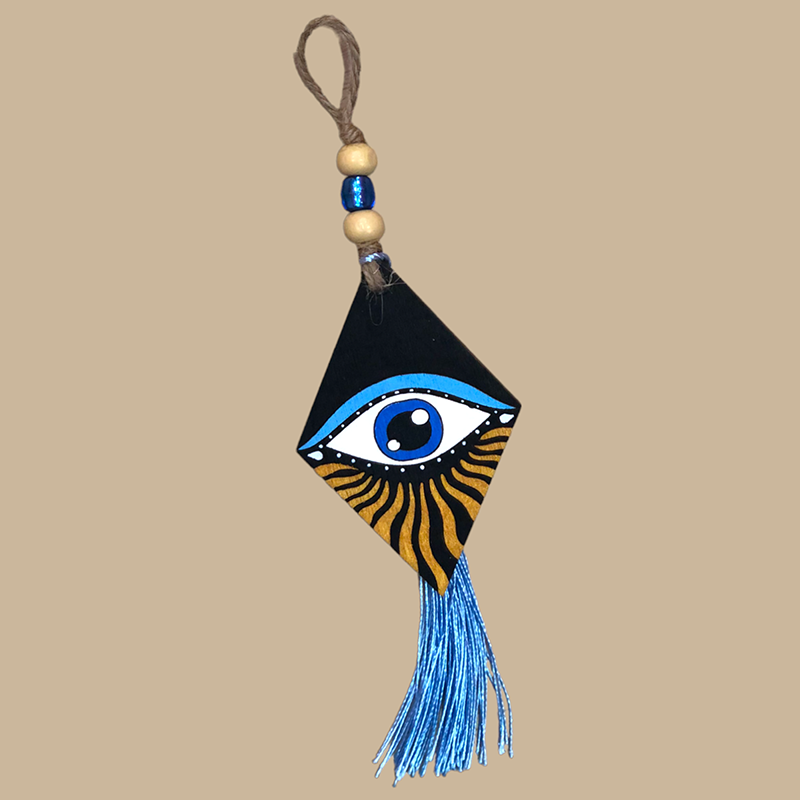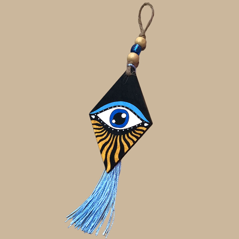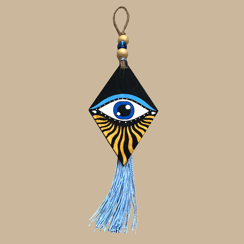 Διακοσμητικό κρεμαστό γούρι με μάτι σε σχήμα ρόμβου, φτιαγμένο από ξύλο κόντρα πλακέ, ζωγραφισμένο στο χέρι και διακοσμημένο από σκοινάκι, γαλάζια φουντίτσα και χάντρες