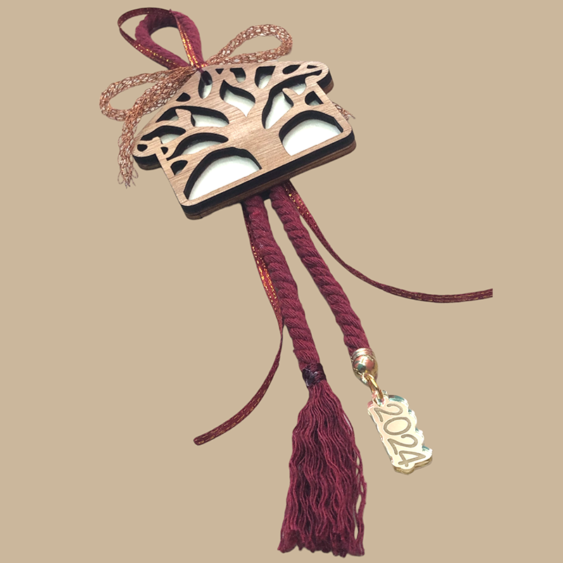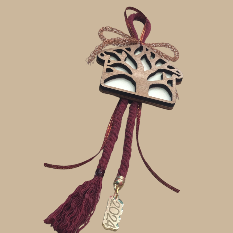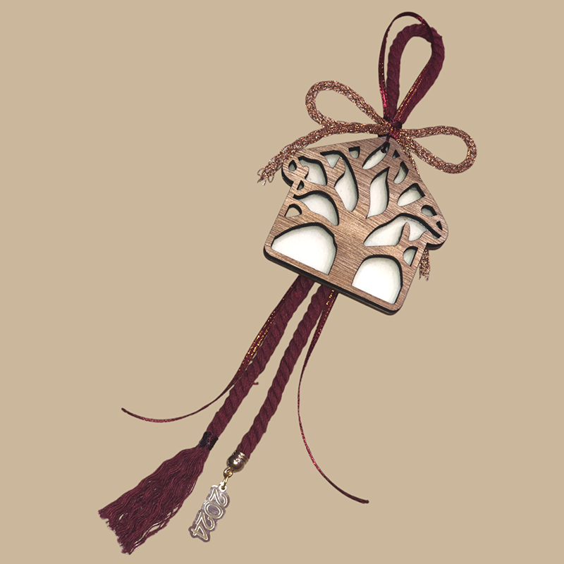 Χριστουγεννιάτικο γούρι σπιτάκι από διπλό ξύλο με κομμένο σχέδιο το δέντρο ζωής, διακοσμημένο με σκοινί και κορδέλες σε μπορντό αποχρώσεις, καθώς και λεπτομέρεια 2024 από χρυσό plexiglass mirror